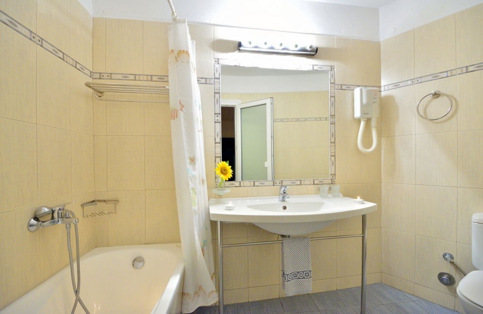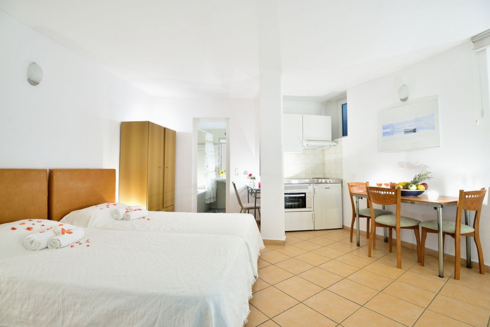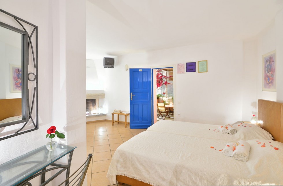 This room is for 2 people. There is available 1 extra bed or cot. This is a studio with a small kitchen and fire place. It has a big new bathroom and outside of the studio is the veranda of the entrace of the hotel always available for your use with the best view to the sunset the sea and the town !