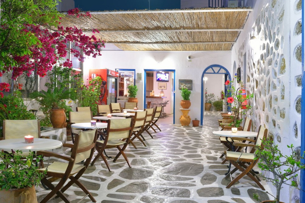 Hotel Nazos also serves breakfast at the hotel bar breakfast place so you may enjoy breakfast at your convenience, served every morning. After a night of indulgence in Mykonos, you will awaken to the smell of coffee and see someone smiling at you! The best start to a perfect day. Enojy breakfast at your convenience, served from 8 till 11 or prepared in advance. After a night of indulgence on the town, you will always wake up and smell the coffee! The best start to a perfect day. Hotel breakfasts are not included in the rate. You can save money for opting to go to one of the towns many excellent patisseries for an enjoyable breakfast. Later, during the day, at the Bar of the Hotel Nazos you can have your drink before joining the nightlife of Mykonos town. Enjoy a beer in the evening before hitting Mykonos town - just a short walk away. So if you are looking for a Mykonos Hotel run by true locals, book and stay with us at our family-run Hotel Nazos. This hotel will be your home away from home on Mykonos!