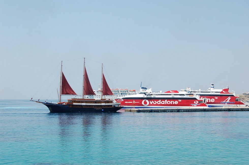 From Herakleion of Crete, there is regular service to Mykonos port by a hovercraft (Flying Cat ) .