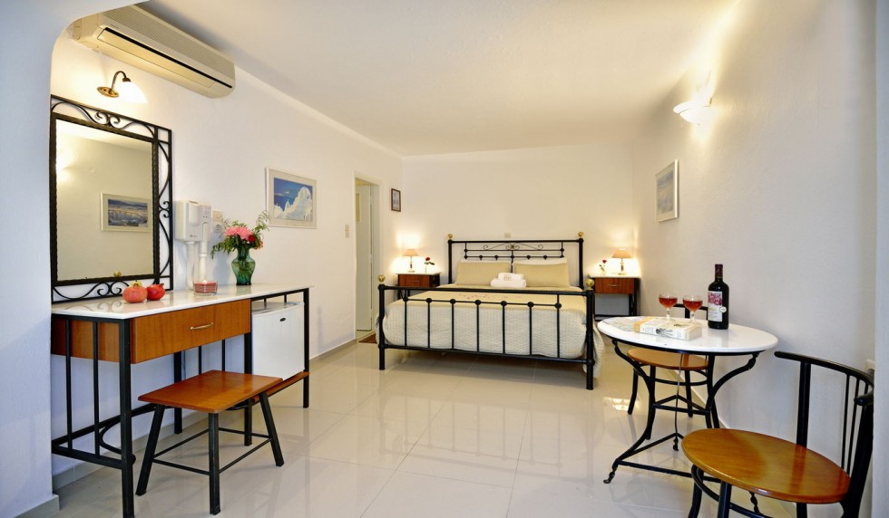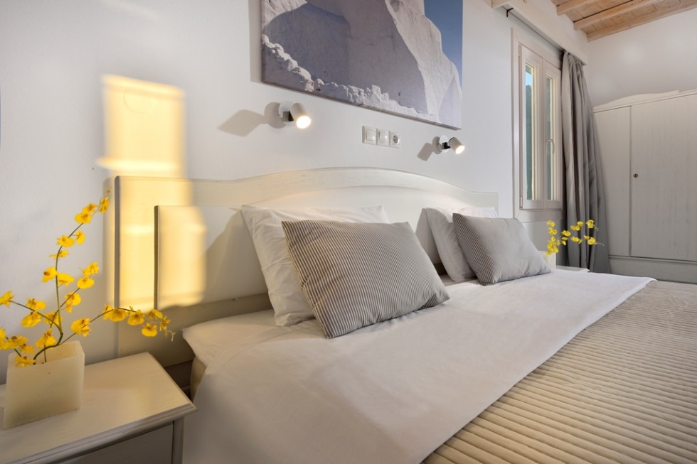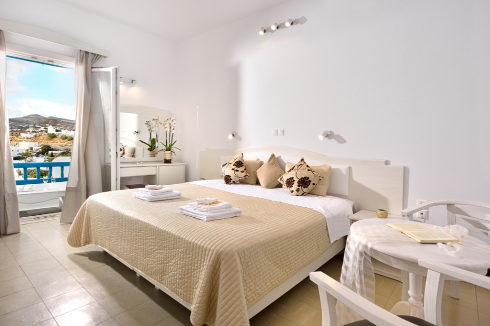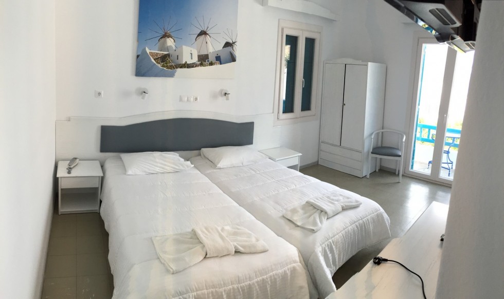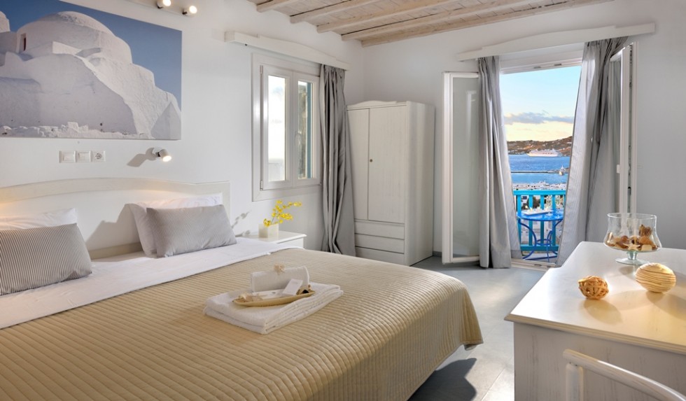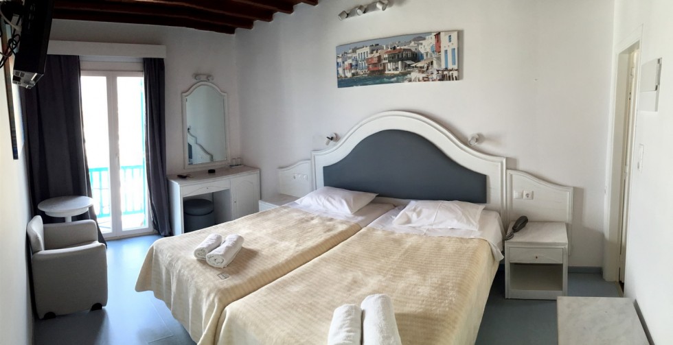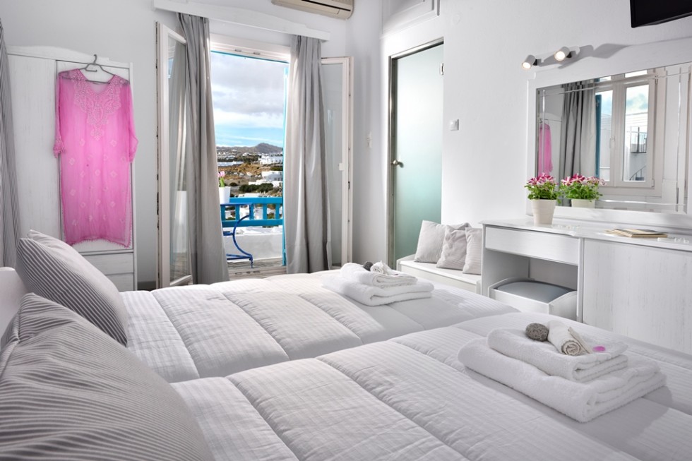 This room is for 2 people. This is a twin bedded or double room with a private balcony or terrace and an amazing view towards mykonos town and the sea. There are available 1 extra bed or cot.